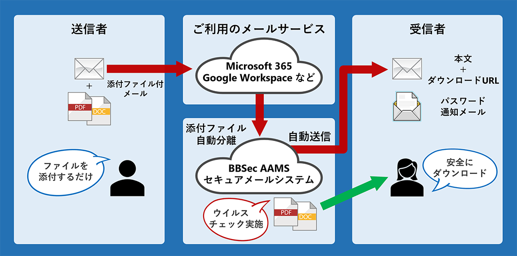 社外宛の添付ファイル付メールをBBSec AAMS® セキュアメールサービスへ転送するように設定いただくことでご利用いただけます。