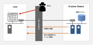 WEBサイトコンテンツ改ざん検知 -Cracker Probing-Eyes® Detect- インターネットを介してお客様のWebサイトコンテンツの改ざん・埋め込みを診断する自動ツールです。 |